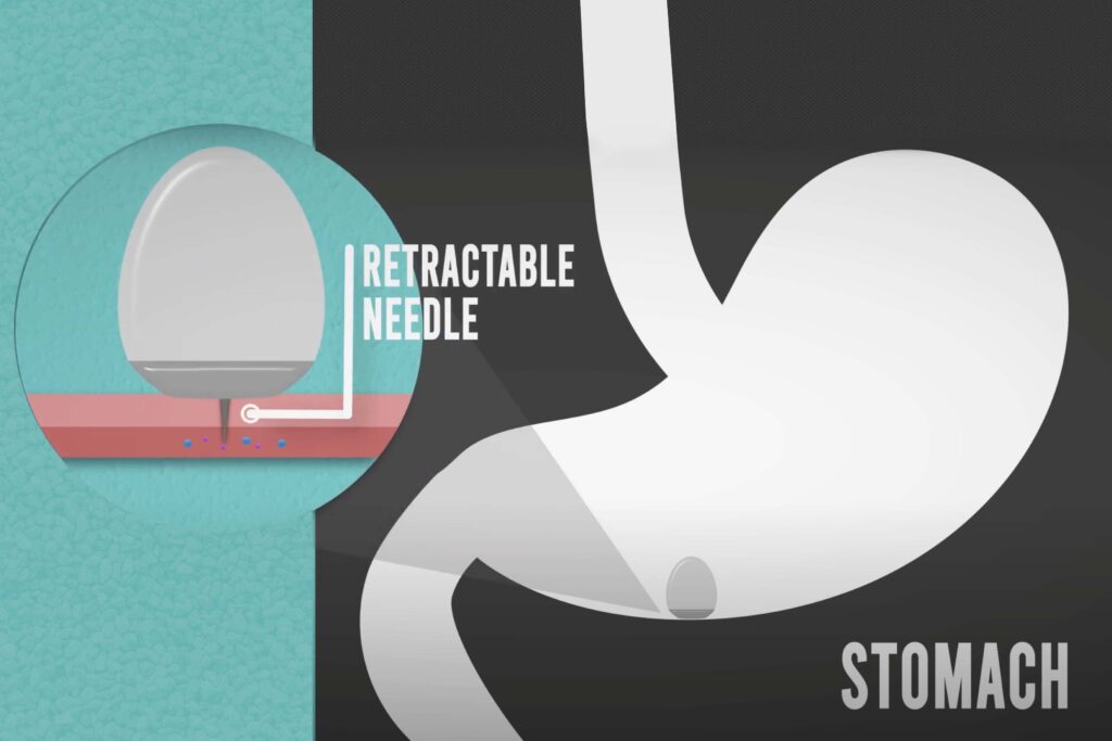 La nueva cápsula de administración está llena de líquido y también contiene una aguja de inyección y un émbolo que ayuda a expulsar el líquido de la cápsula. La aguja y el émbolo se mantienen en su lugar mediante una pastilla de azúcar sólida. A medida que la cápsula ingresa al estómago, el ambiente húmedo hace que el gránulo se disuelva, empujando la aguja hacia la mucosa gástrica, mientras que el émbolo empuja el líquido a través de la aguja. Cuando la cápsula está vacía, un segundo émbolo empuja la aguja hacia el interior de la cápsula para que pueda excretarse de manera segura a través del tracto digestivo.