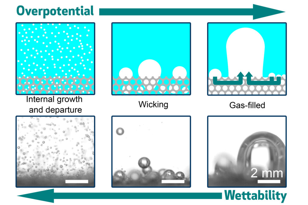 Usar electricidad para dividir el agua en hidrógeno y oxígeno puede ser una forma eficiente de producir hidrógeno de combustión limpia, con otros beneficios si esta electricidad se produce a partir de fuentes de energía renovables. Pero a medida que mejoran las tecnologías de separación de agua, a menudo utilizando materiales de electrodos porosos para proporcionar superficies más grandes para las reacciones electroquímicas, su eficiencia a menudo se ve limitada por la formación de burbujas que pueden bloquear u obstruir las superficies reactivas.